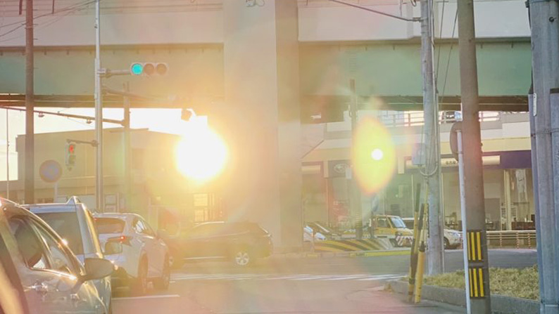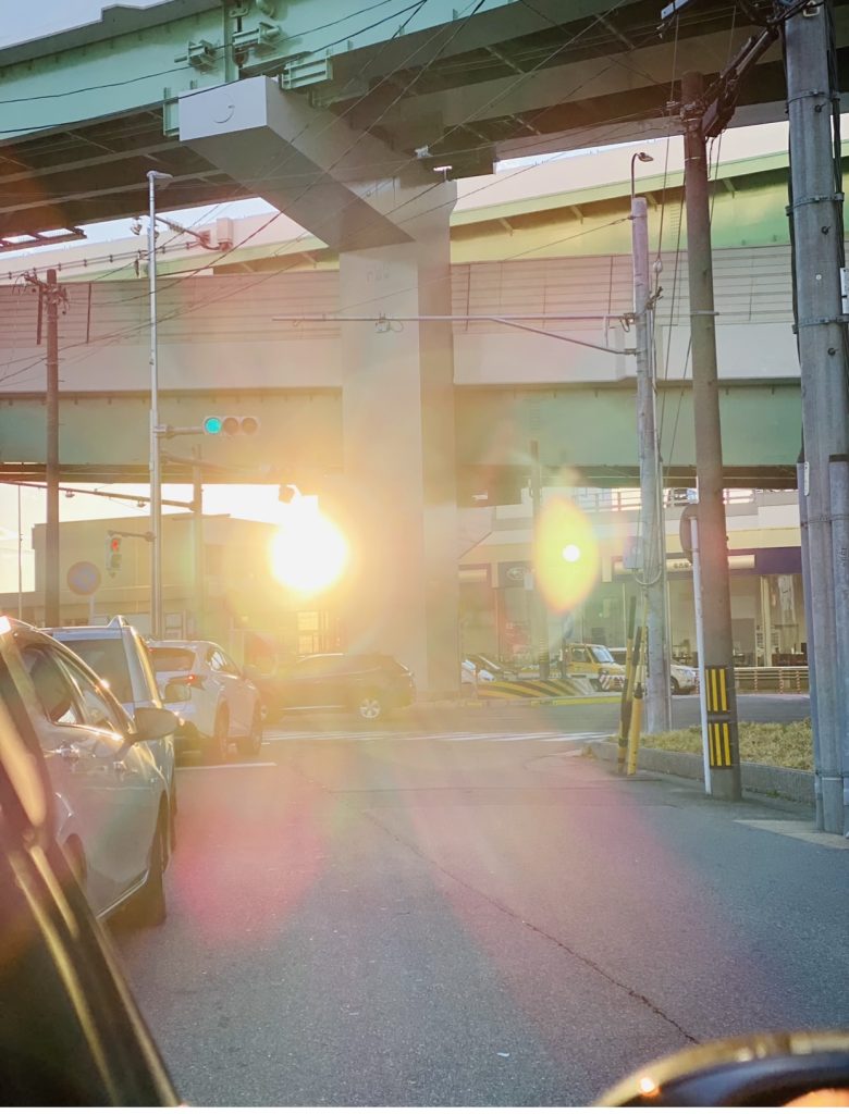 赤信号の間、いろいろクヨクヨ考えていたら、ピカーーッと夕陽が差し込んだ。