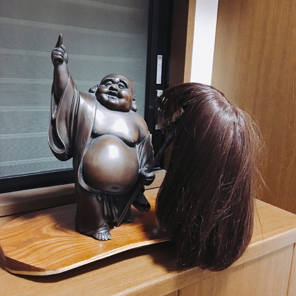 我が家の玄関には、亡き祖父が大事にしていた置物を置いています。 福と財を呼んでくれる縁起物と信じ玄関に飾り、勝負事や試験日などは、手を合わせ祈ったり、お腹をなでたりし、崇拝しておりました。 抗がん剤治療が始まり脱毛してからは、ウイッグスタンドに変化。 笑顔でウイッグを受け止めてくれる懐の広さに毎日癒されておりました。 布袋さんありがとう!!