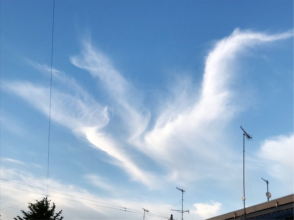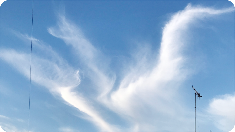 4月20日に子宮体がんの手術を受けました。その後しばらく自宅療養をしていました。写真はその頃、腸が癒着しないように散歩をしていた時に見つけた雲です。まるで鳳凰のような鳥が青空を羽ばたいているように見えて、この雲を見て、私も今は辛いけどきっと元気になって羽ばたける日が来る!と勇気づけられました。今は経過観察で元気に頑張っています。