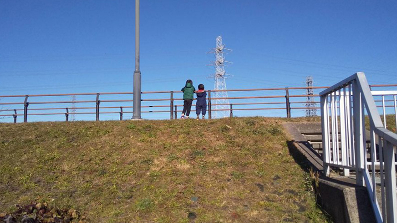 いつも家族で行く公園。青空を仰ぐ、子どもたちの後ろ姿。ありふれた日常のようだけど、この後ろ姿を見続けたい。未来を描くとは、ありふれた日常をも奇跡だということだと思います。この時、着ていた兄の緑色の上着は、現在では弟が着ています。先の見えない未来だと感じていた景色が現在になりました。