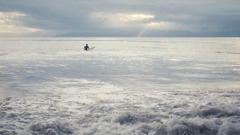 乳癌の治療を終えて2年がたち、鎌倉の材木座海岸を散歩しながら、人生について考えていた時、ふと雲の隙間から美しい一筋の光をみつけた。そしてその光を仰ぐサーファーがとても神々しく思えた。