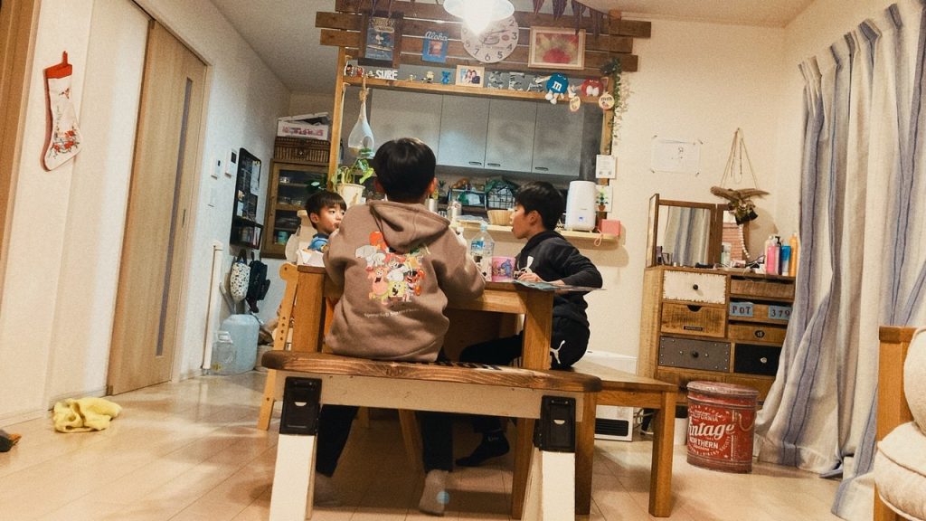 抗がん剤の副作用でダウンしていた時、布団から撮影したこどもたちだけでご飯を食べている様子。幼いと思っていたこどもたちが、こどもたちだけでご飯を食べられるようになったのかという驚きと逞しさを感じたい瞬間でした。また、この時のご飯はお友達が作って持ってきてくれたおかずを食べています。今思い出しても周りに助けられた恵まれた日々でした。